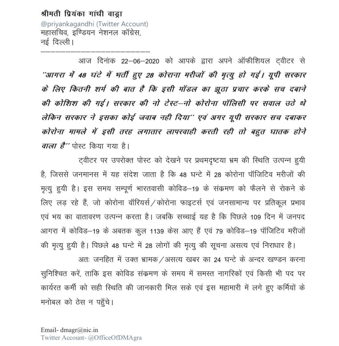તેના જવાબમાં આગરાના ડીએમ પ્રભુ નારાયણ સિંહએ પ્રિયંકાના ટ્વીટને રી-ટ્વીટ કરી લખ્યું કે જે અખબારમાં અત્યાર સુધી કુલ કોરોના સંક્રમિત દર્દીઓના મોતના સંબંધમાં ડેથ ઓડિટનો આધાર આપ્યો છે. છેલ્લા 109 દિવસમાં આગરમાં કુલ 1136 કેસ અને 79 મોત થયા છે. છેલ્લા 48 કલાકમાં દાખલ થયેલા 28 કોરોનાના દર્દીઓના મોતની વાત ખોટી છે.